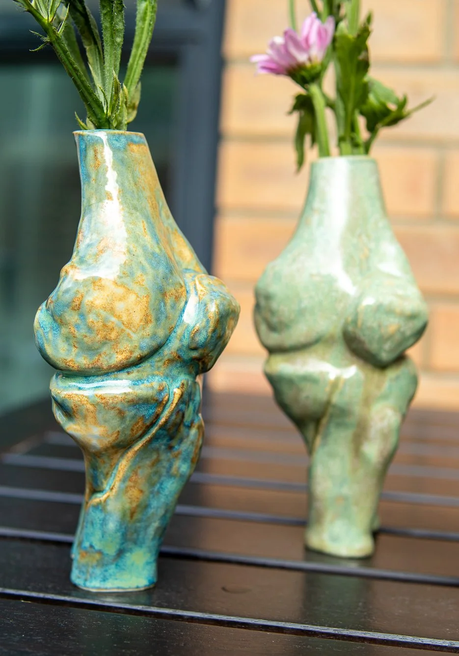 I had previously designed a sweeping wavy vase for the purpose of testing alcohol inks (as seen on the white plastic vase to the right) and wanted to see if it was possible to reproduce this in clay; not using slip casting but using the same slab press method I’d started to perfect.