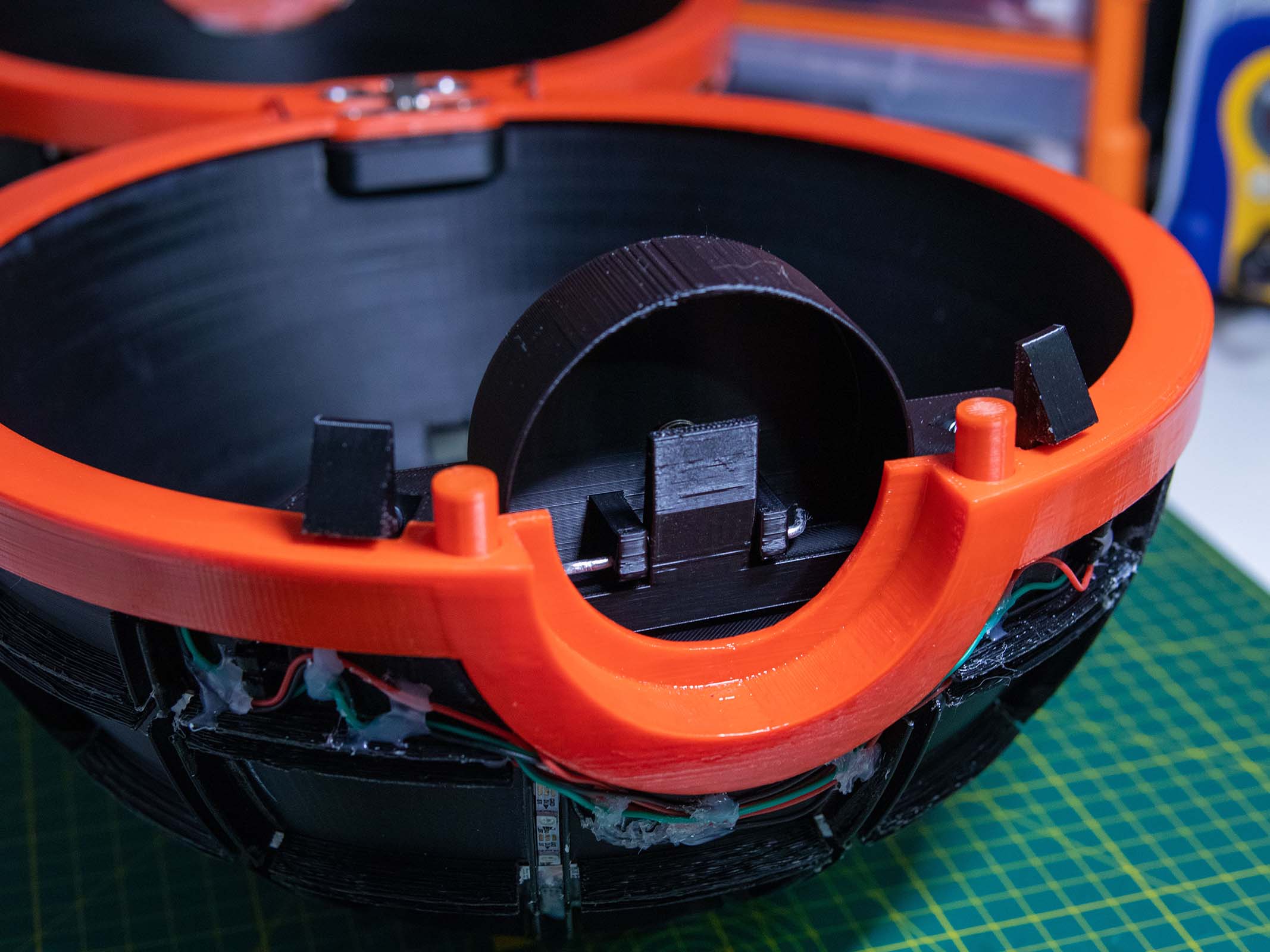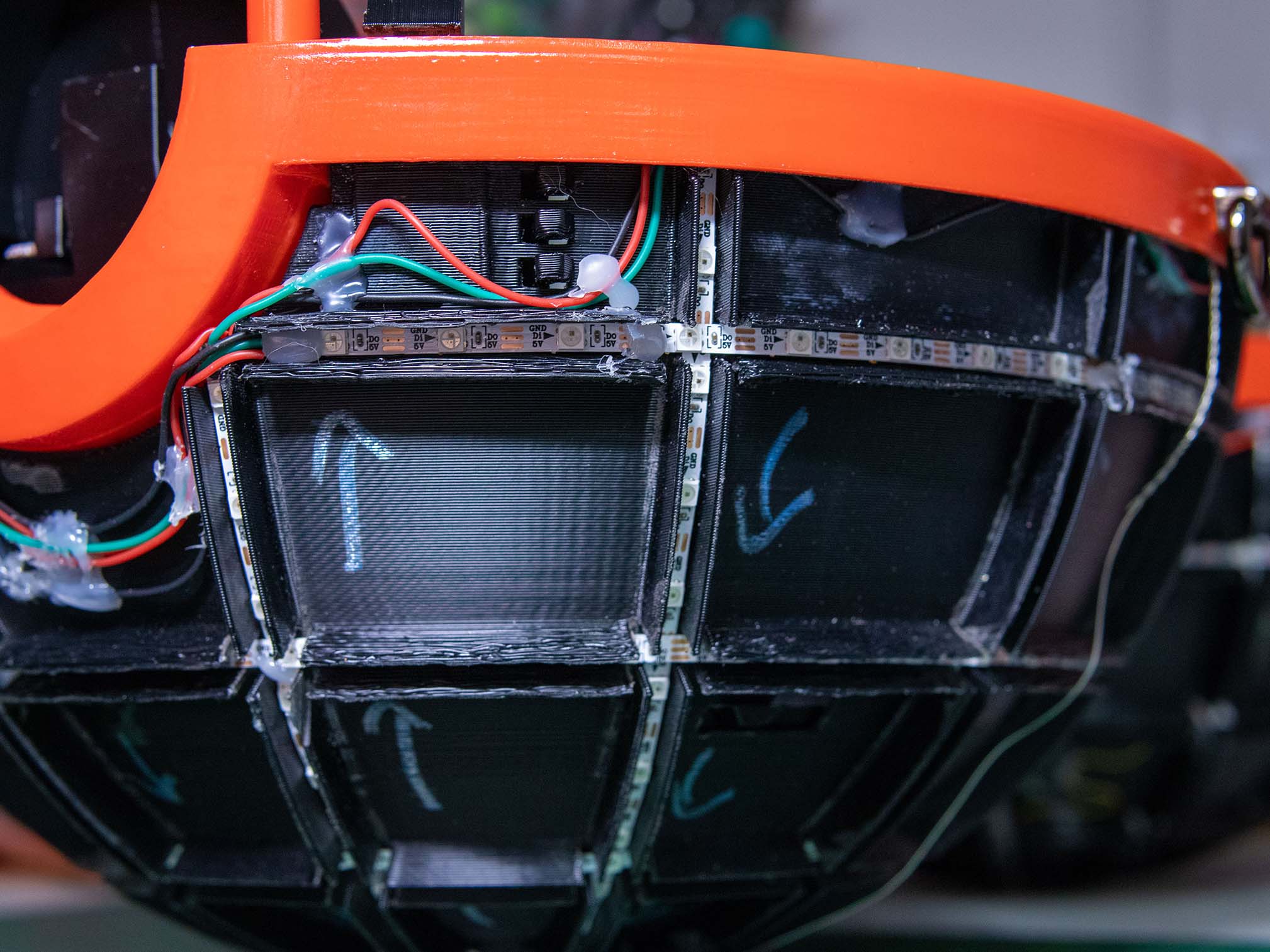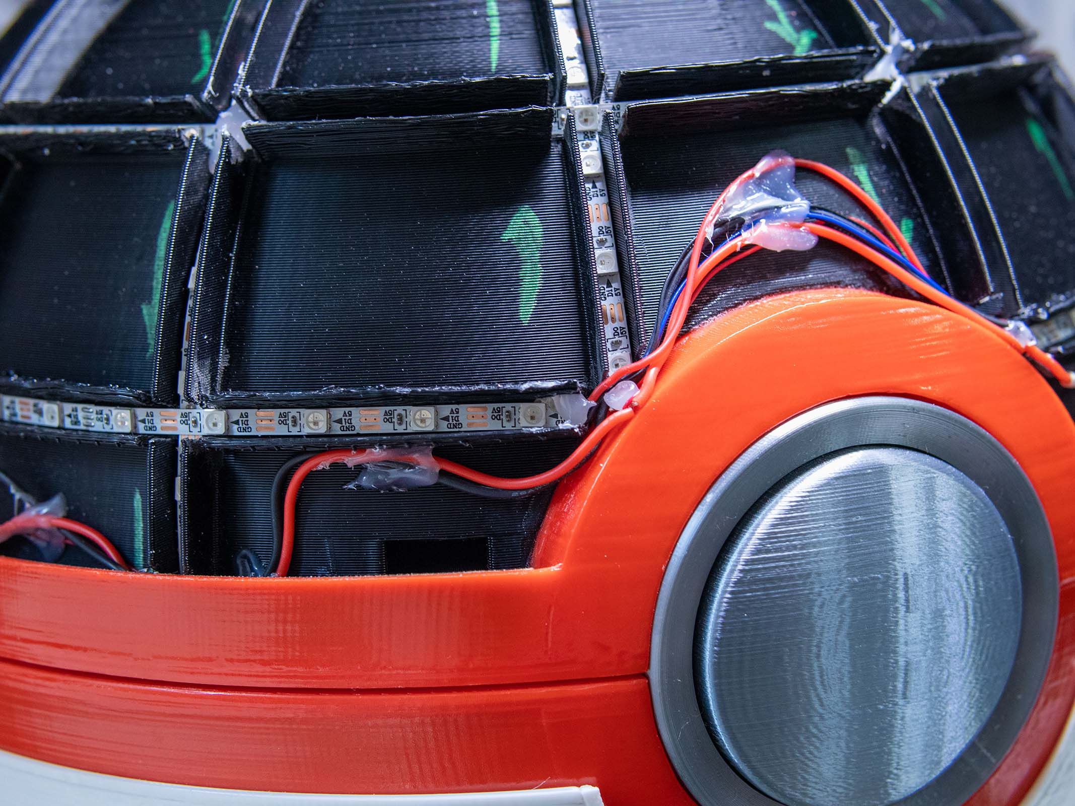 Digital Fabrication & Finishing: Modeled in Autodesk Fusion 360, the ball was designed to be printed in multi-part assemblies that maxed out the build volume of a Creality CR-10S Pro V2. The design utilizes a black structural inner core for the LED housing, a 2mm white outer diffusion layer, and structural red rims to conceal the custom hinges.