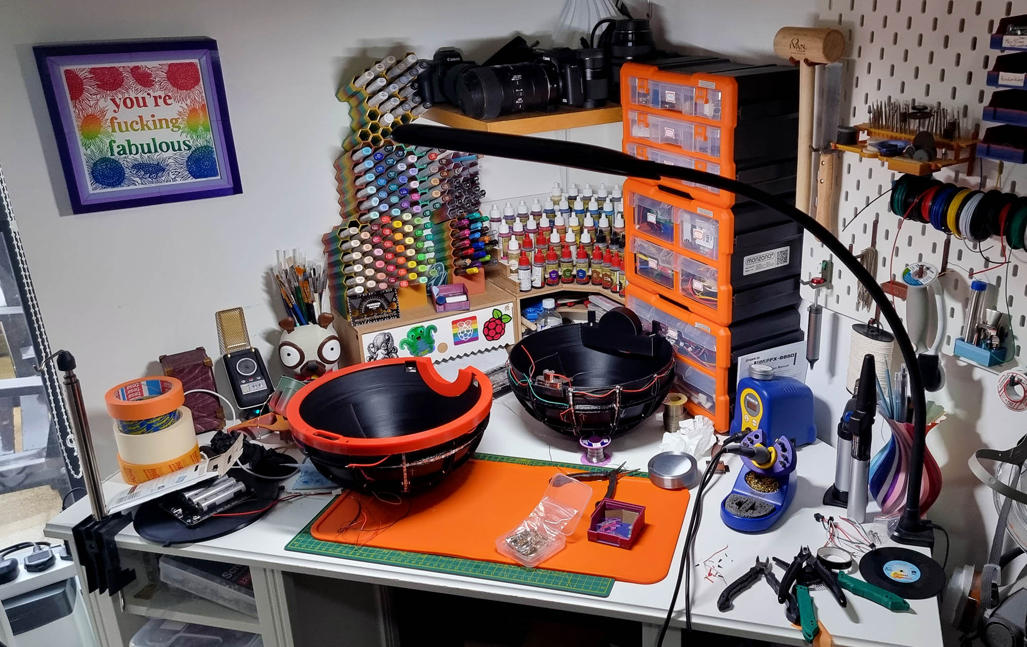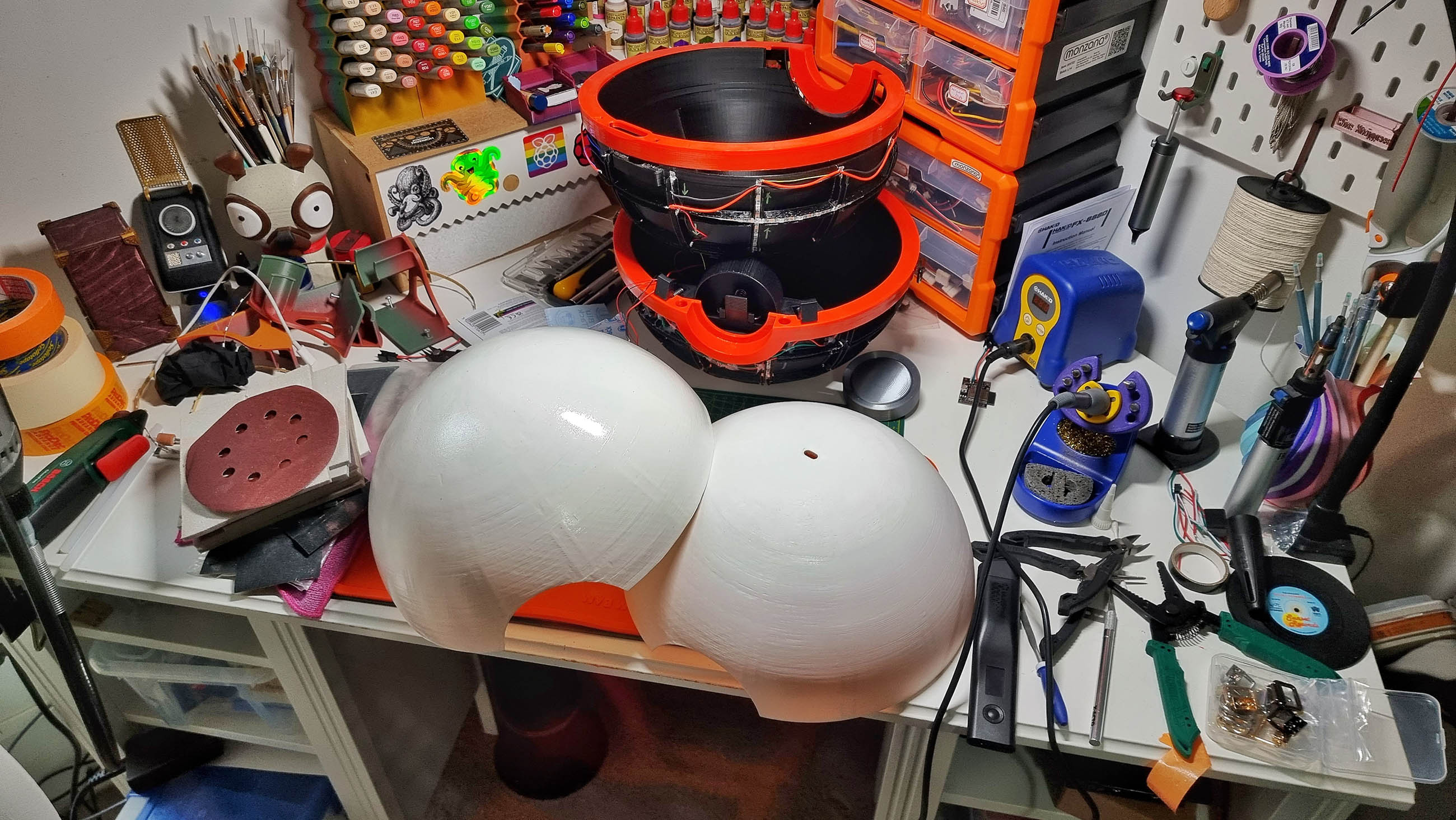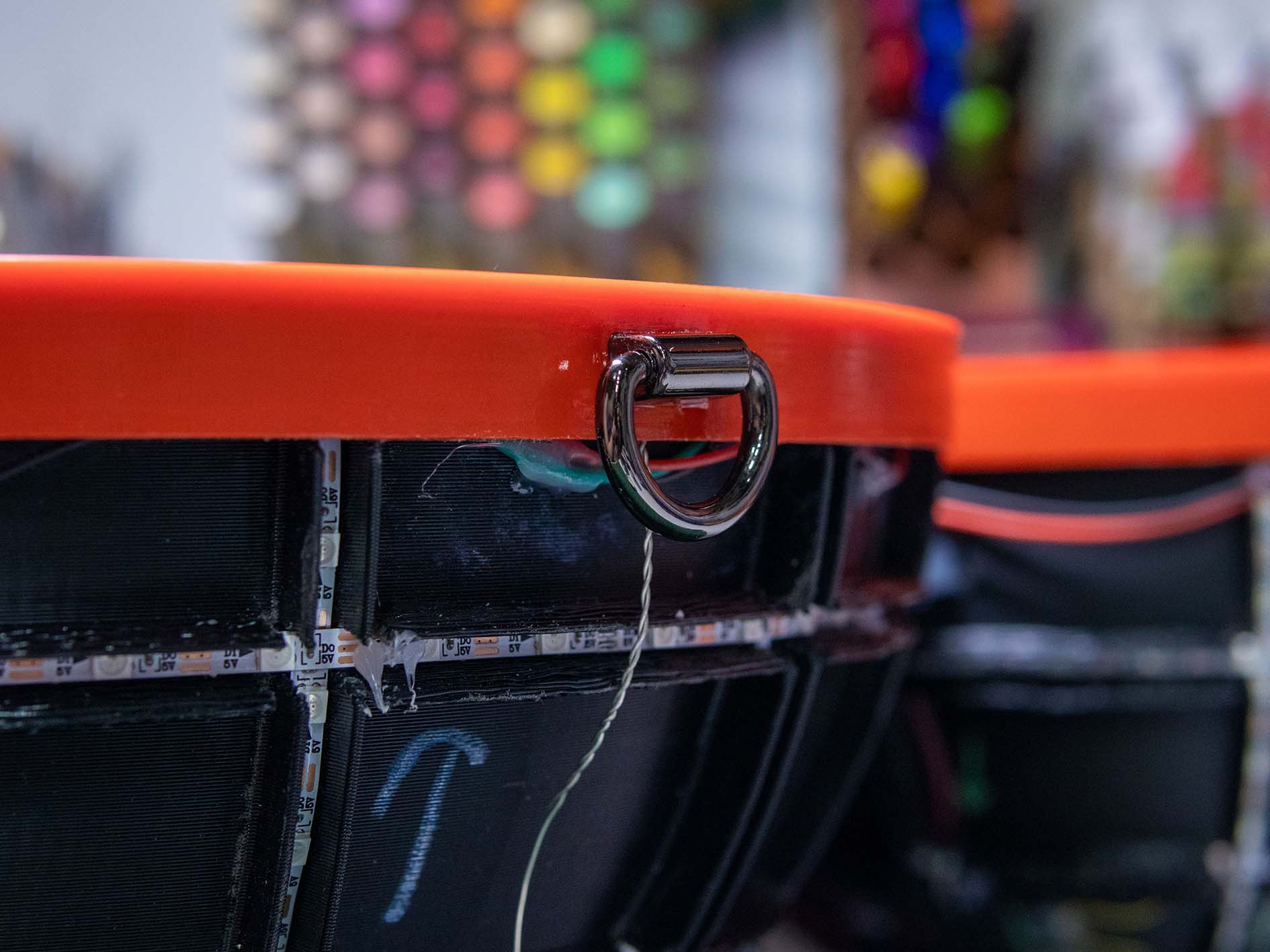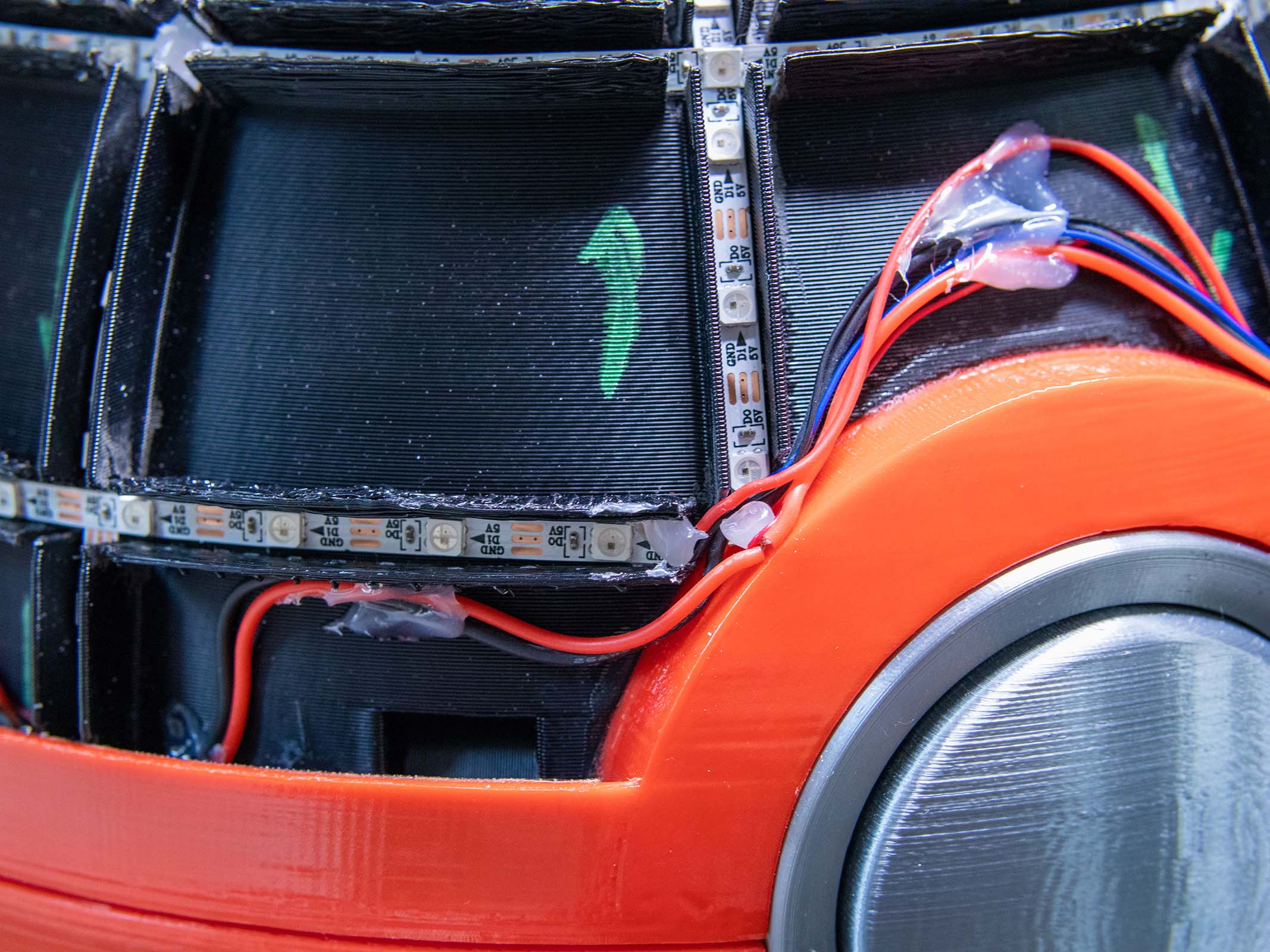 Digital Fabrication & Finishing: Modeled in Autodesk Fusion 360, the ball was designed to be printed in multi-part assemblies that maxed out the build volume of a Creality CR-10S Pro V2. The design utilizes a black structural inner core for the LED housing, a 2mm white outer diffusion layer, and structural red rims to conceal the custom hinges.
