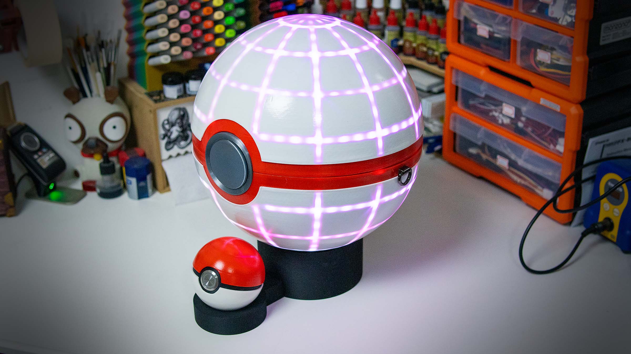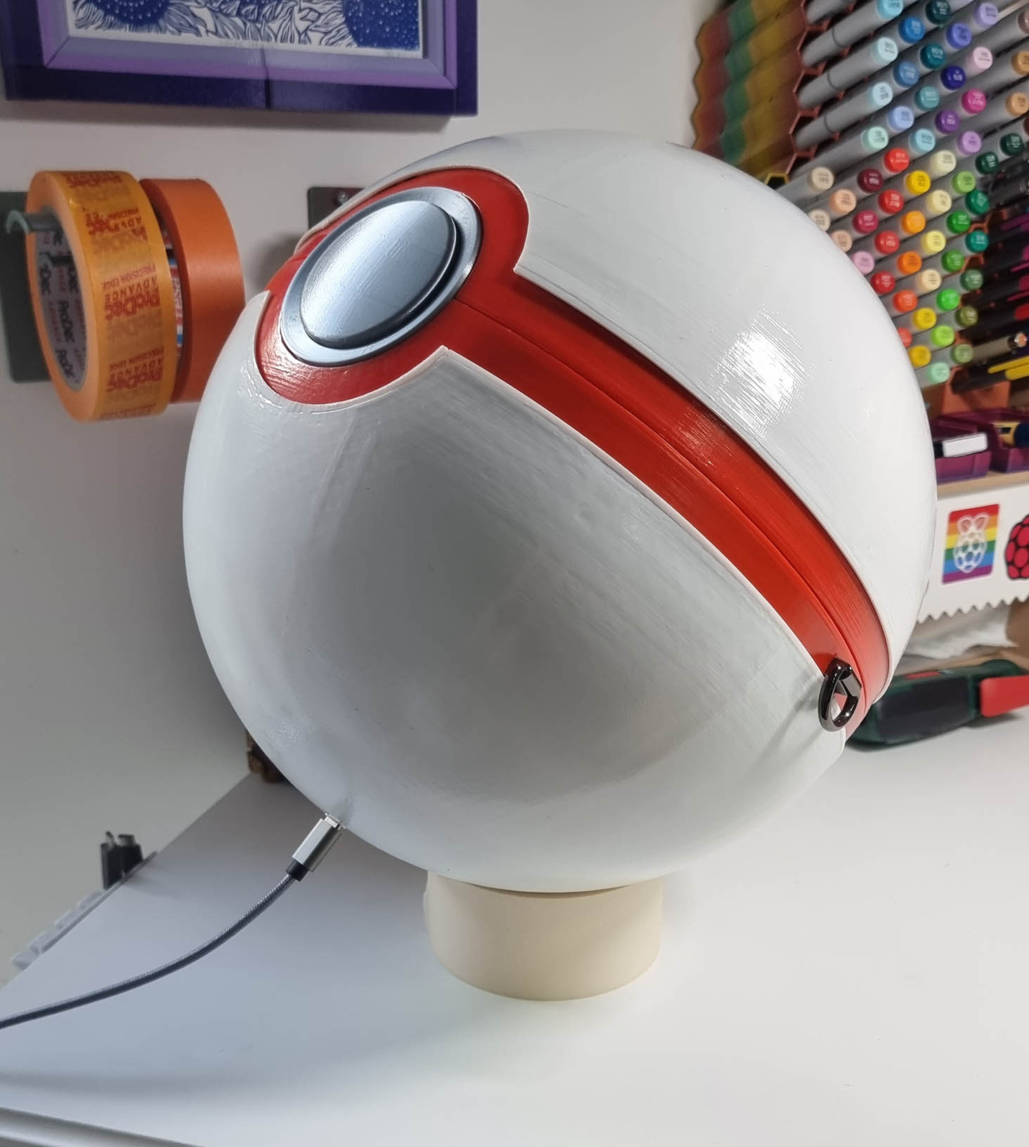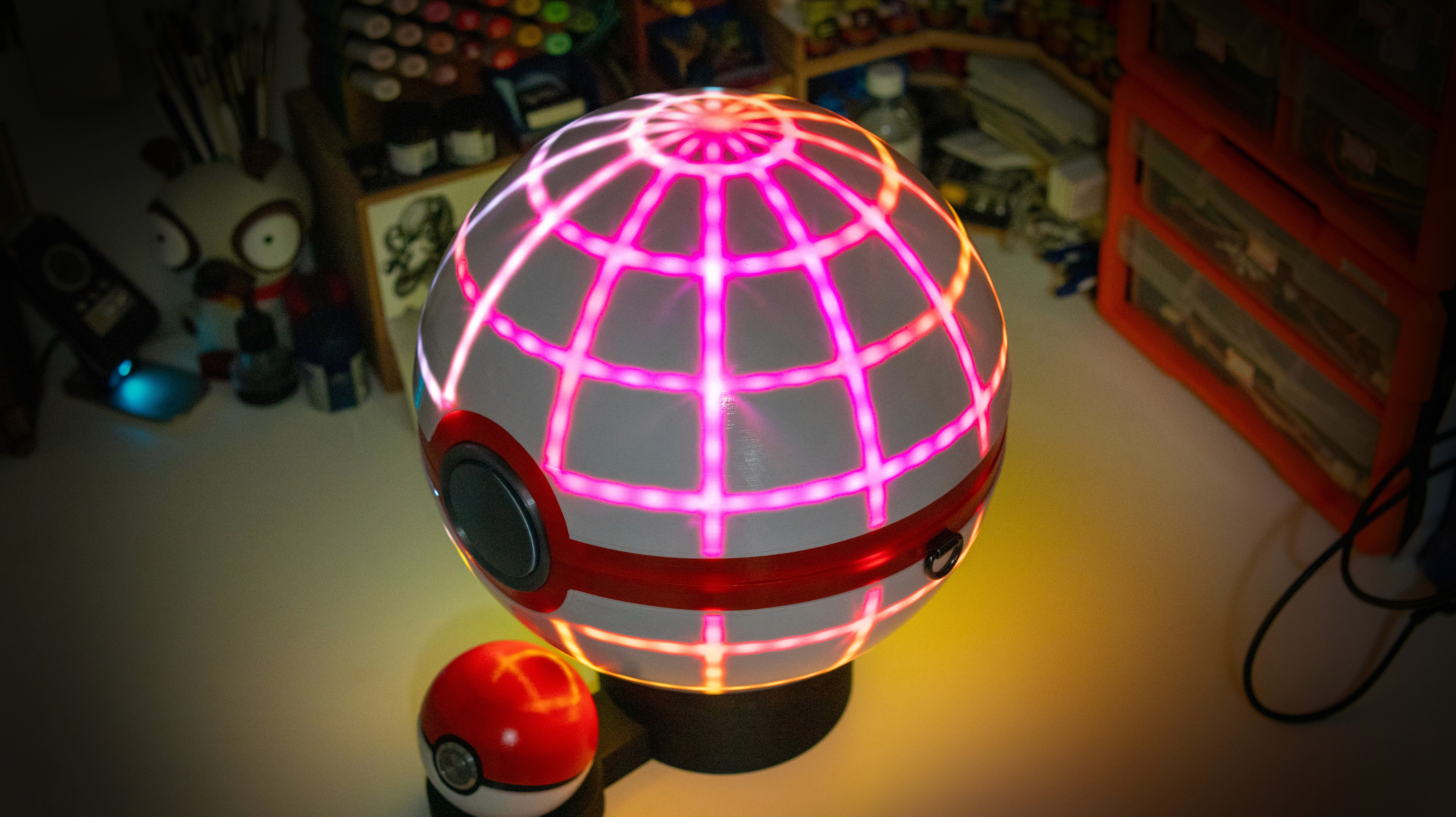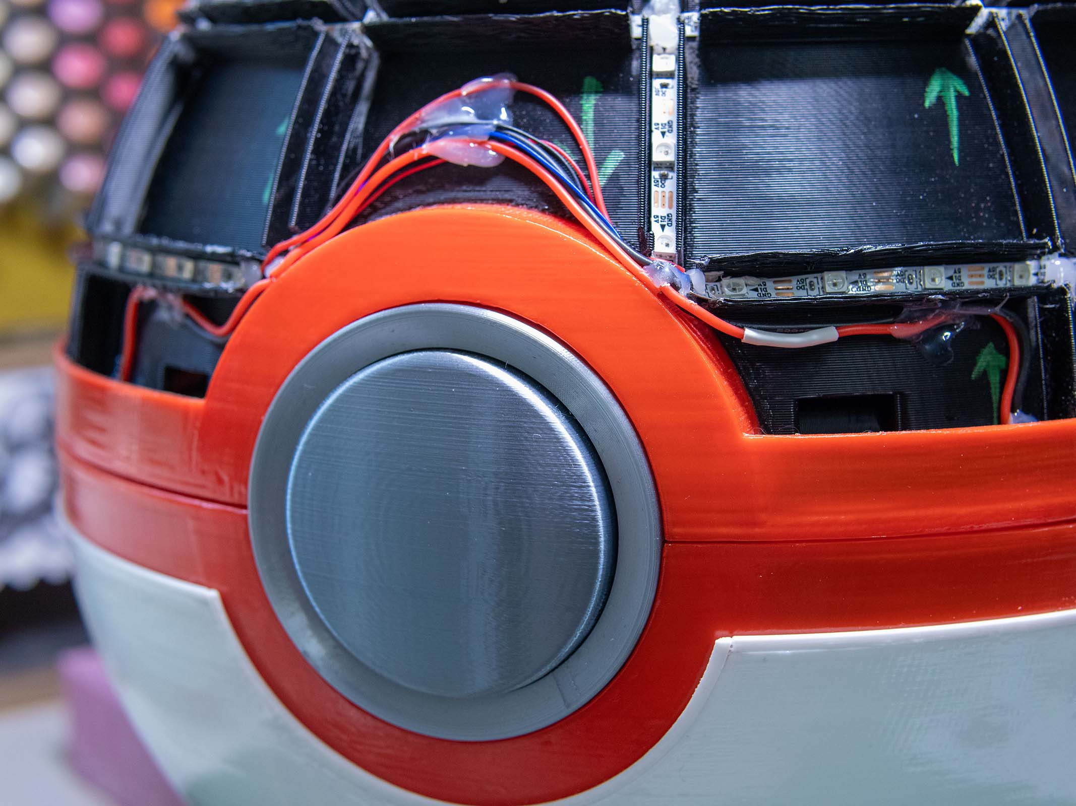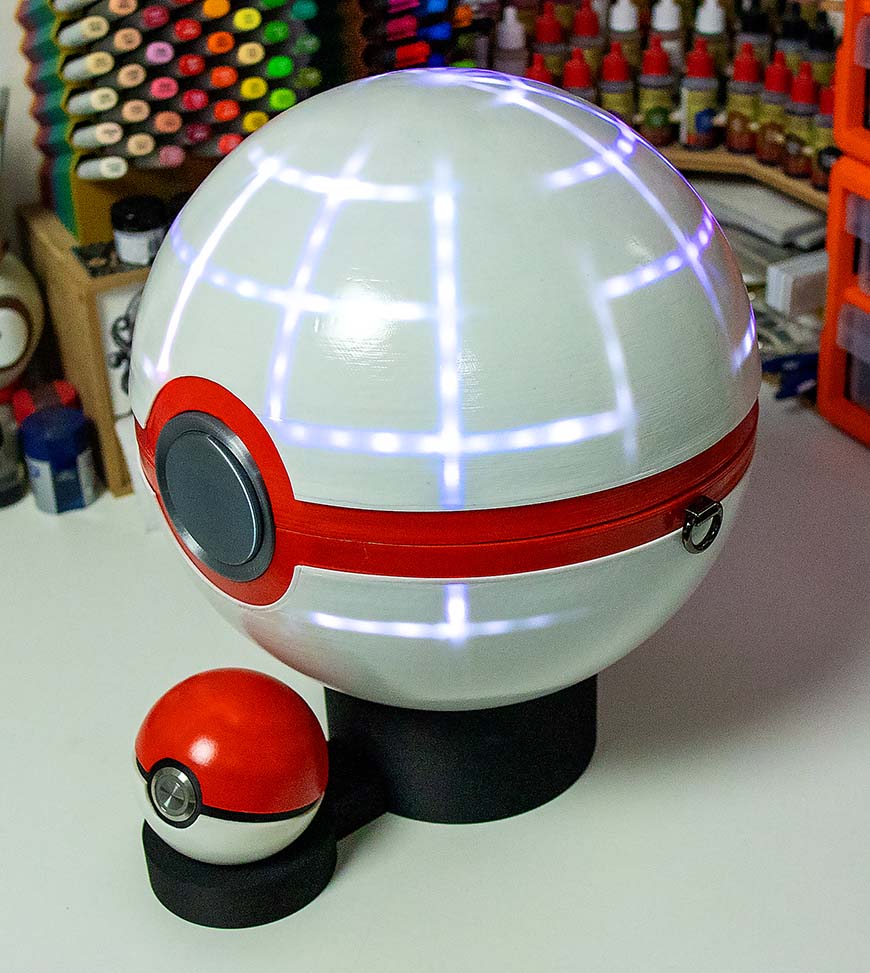 A fully functional and almost completely FDM 3D printed shoulder bag in the shape of the iconic Dynamax Ball from Pokemon Sword and Shield. The project features wireless networking, 3D mapped LEDs, and custom mechanical engineering.