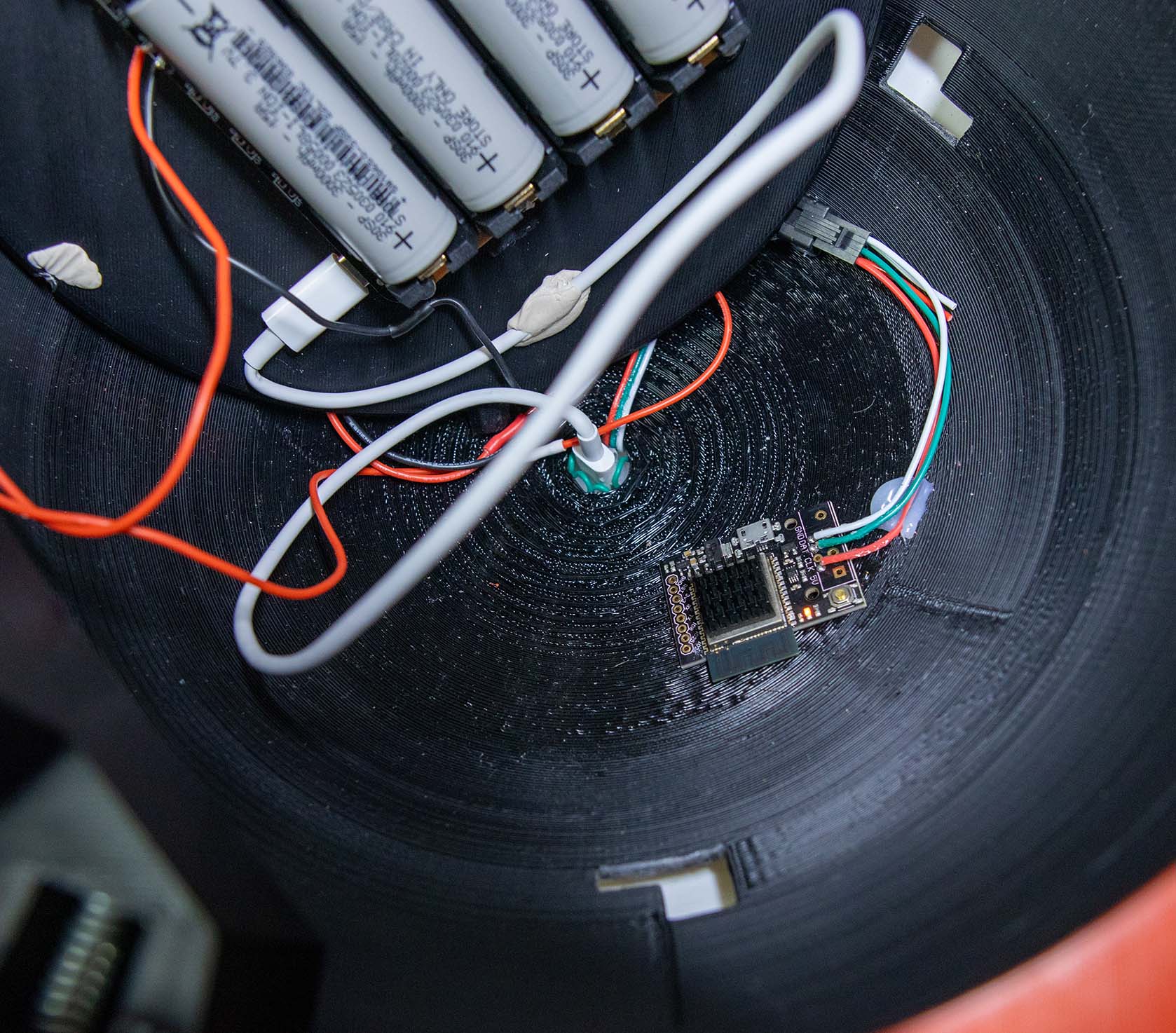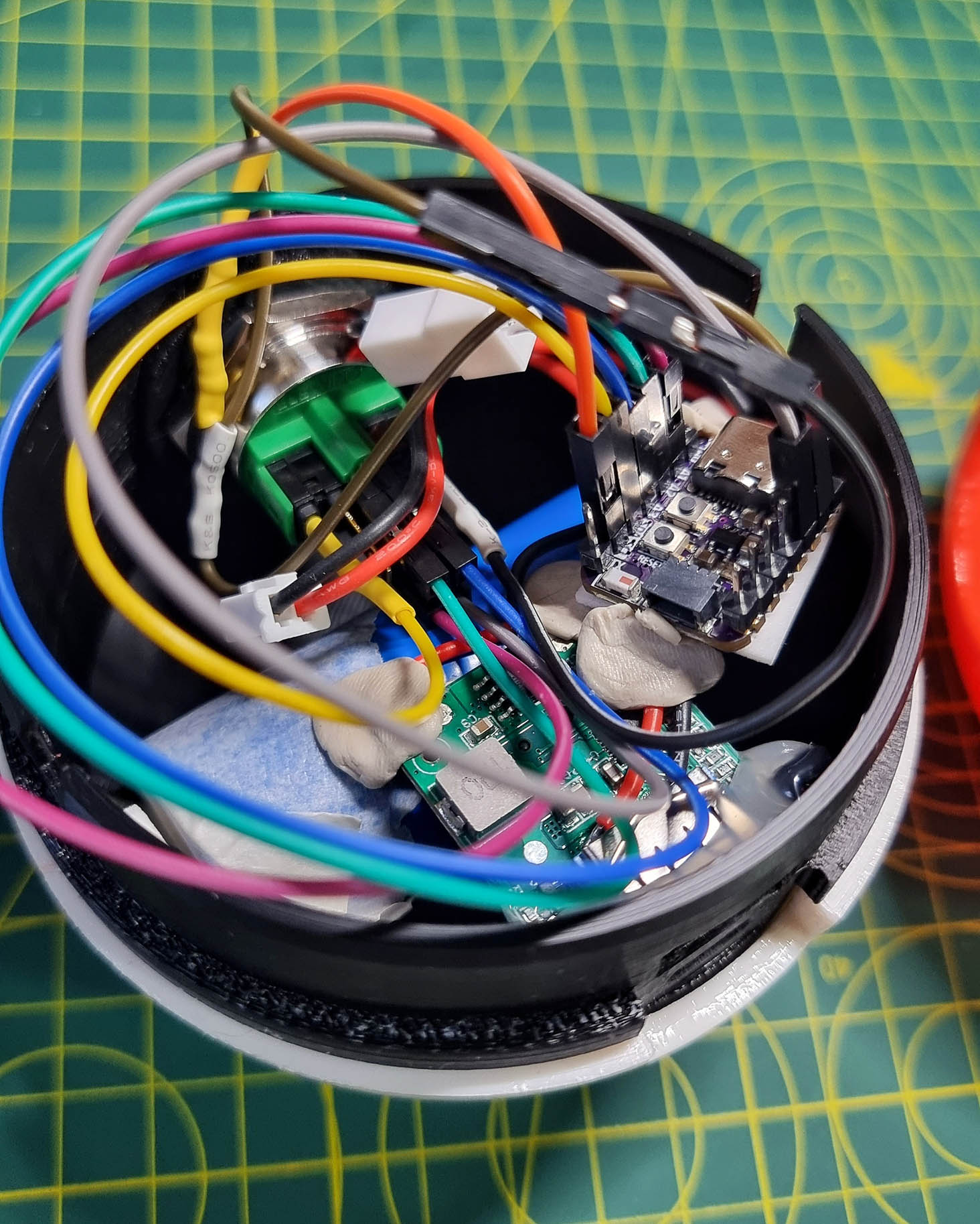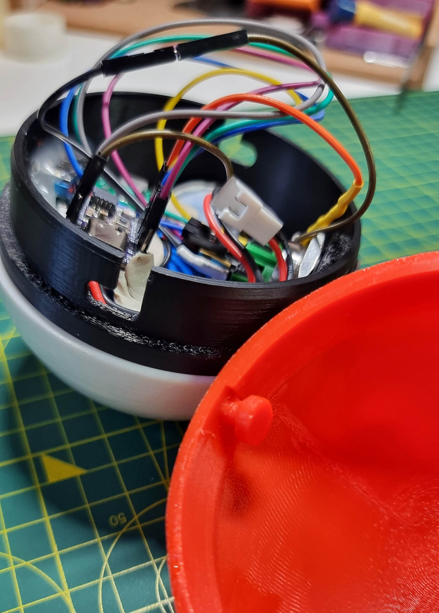 Custom Electronics & Wireless Networking: To achieve the "magic" of remote activation, I engineered a discrete control system hidden inside a secondary, palm-sized Poké Ball. This remote features a twist-lock shell housing a 5000 mAh lithium-ion battery and a QT Py C3 ESP-32 board. Pressing the external metal button triggers code that communicates wirelessly with the primary Dynamax Ball to turn on or off depending on previous state.