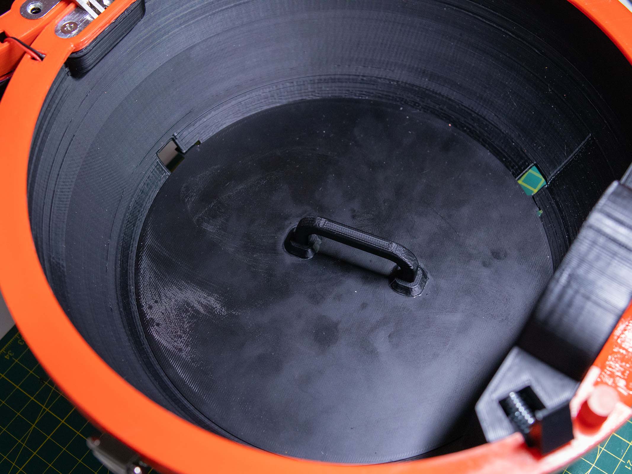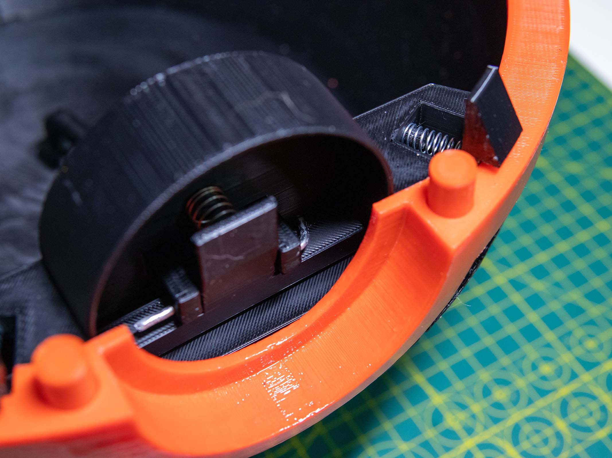 Mechanical Engineering & Latching Mechanisms: Turning a rigid, 30cm plastic sphere into a functional bag required precise mechanical balancing. The internal latching system relies entirely on custom 3D-printed levers and nine compression springs featuring four different tension levels. This mechanism perfectly balances the upward force required to lift nearly a kilogram of plastic and electronics with the exact pressure needed to keep the internal latches secured until the primary release button is pressed.
