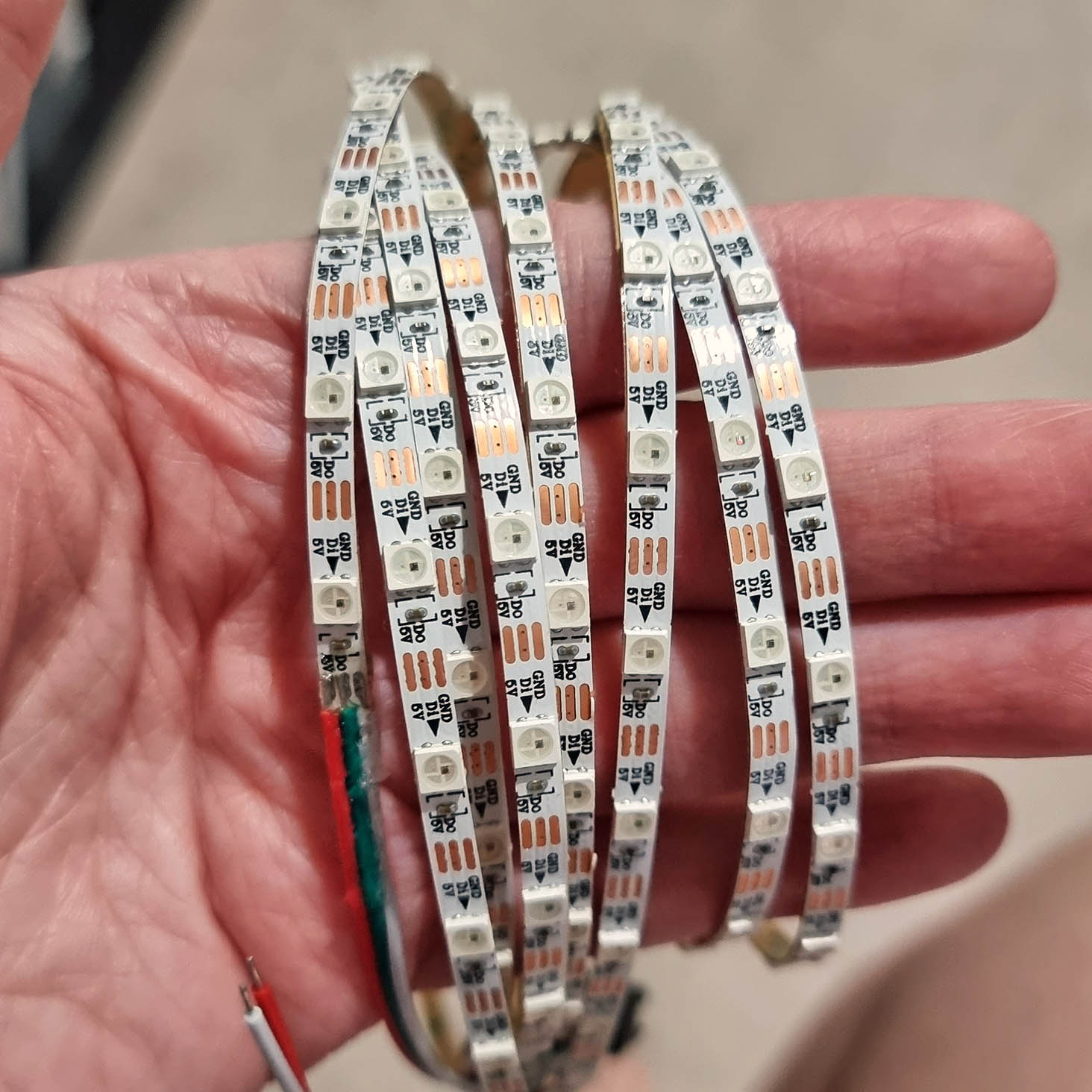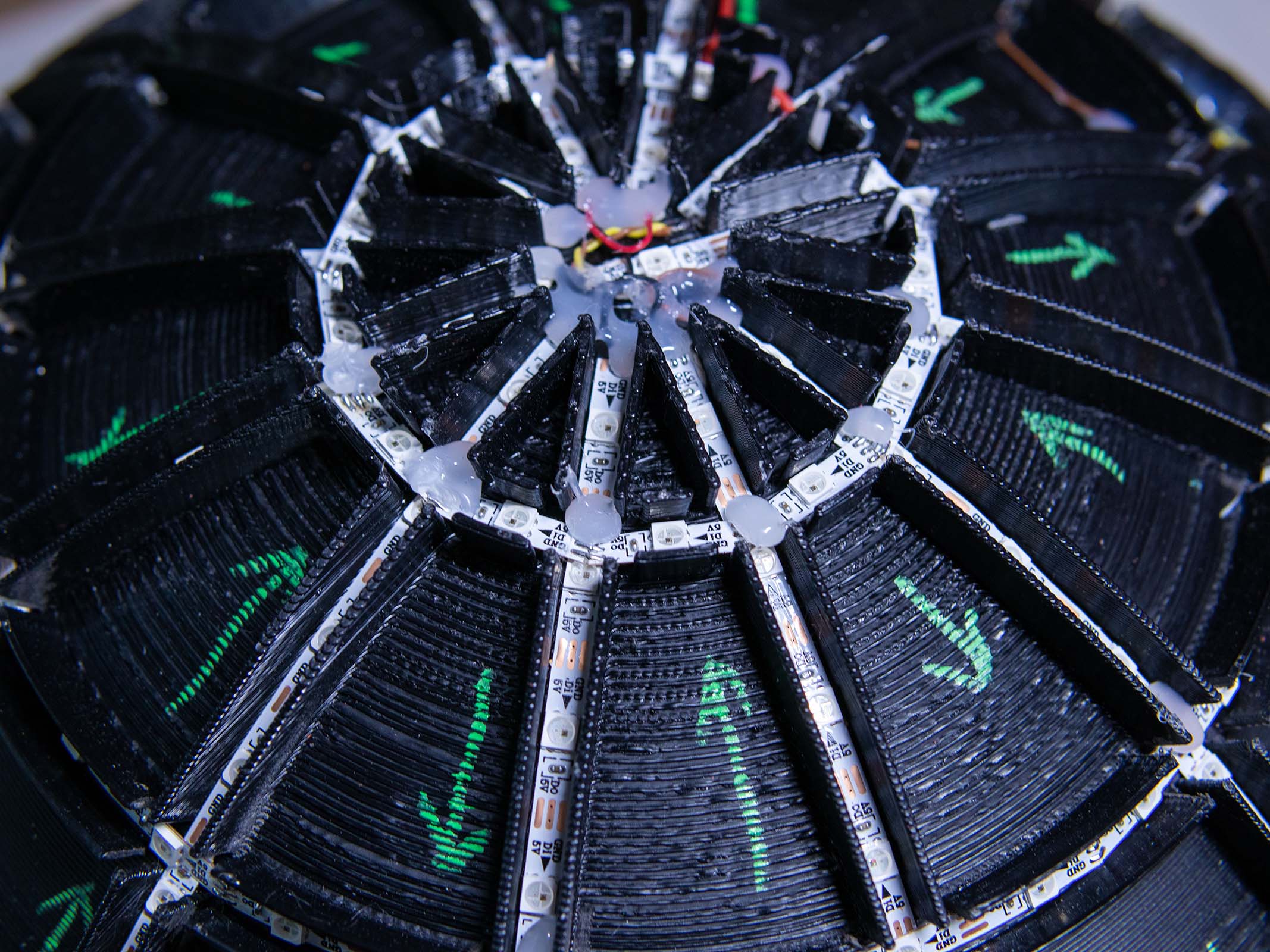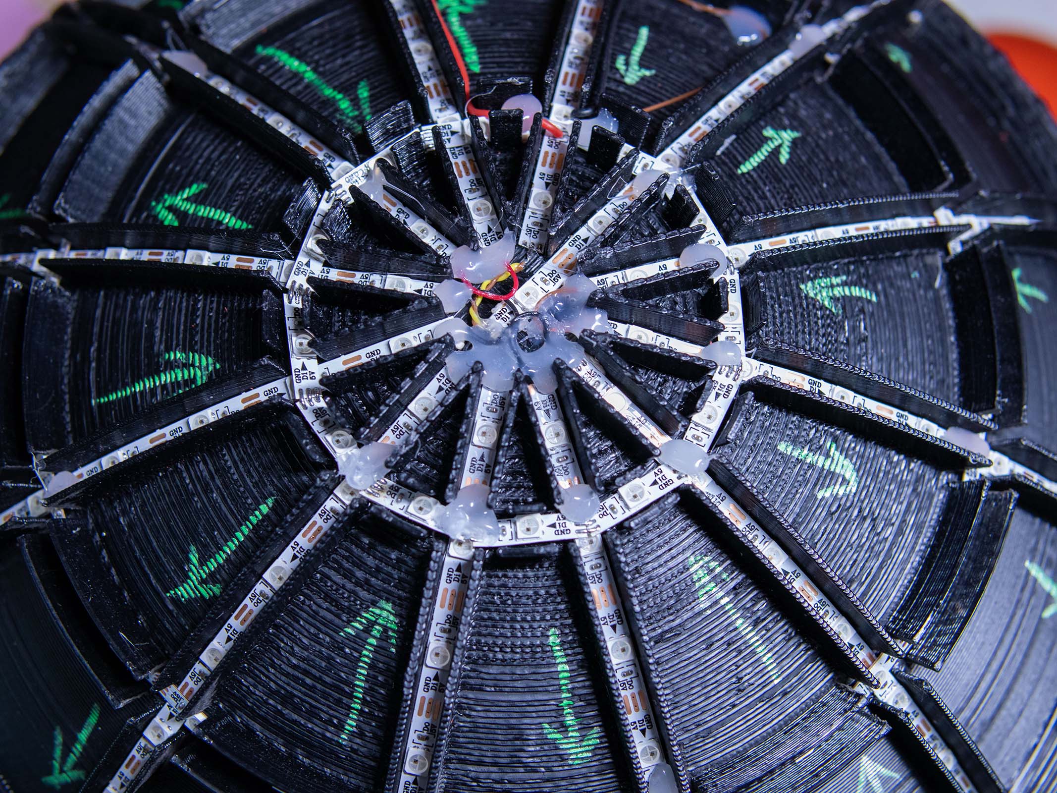 The main ball is driven by a PixelBlaze microcontroller and powered by four 3000mAh 18650 batteries. The PixelBlaze handles the complex 3D mapping required to animate 535 individually soldered WS2812 LEDs, which are arranged in a serpentine layout to create fluid, multi-dimensional light shows across the sphere's surface without visible seams.