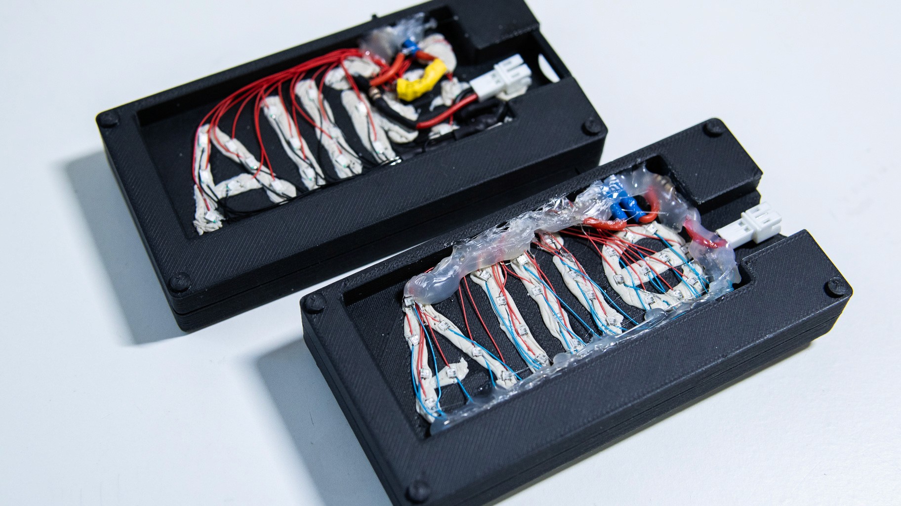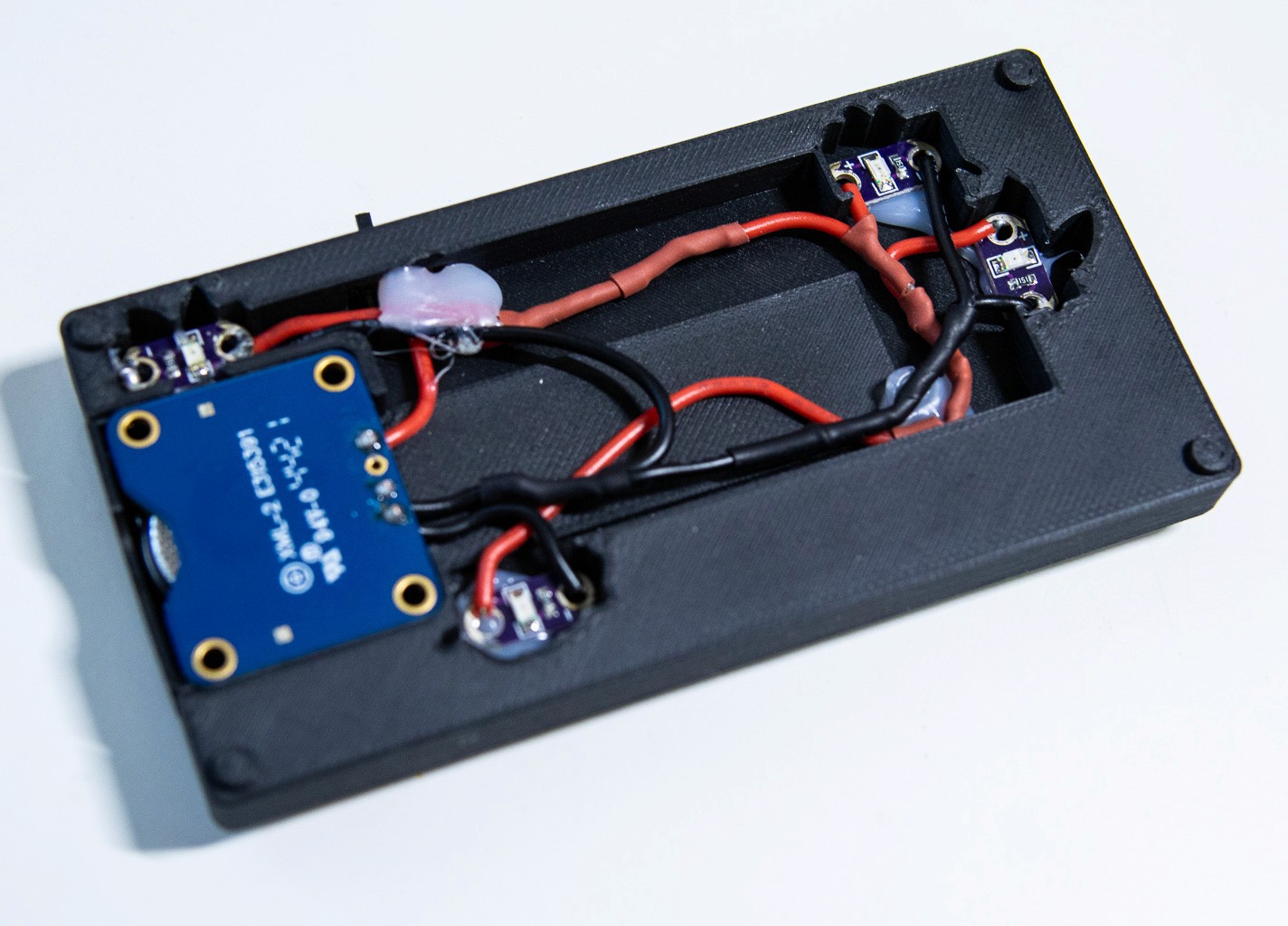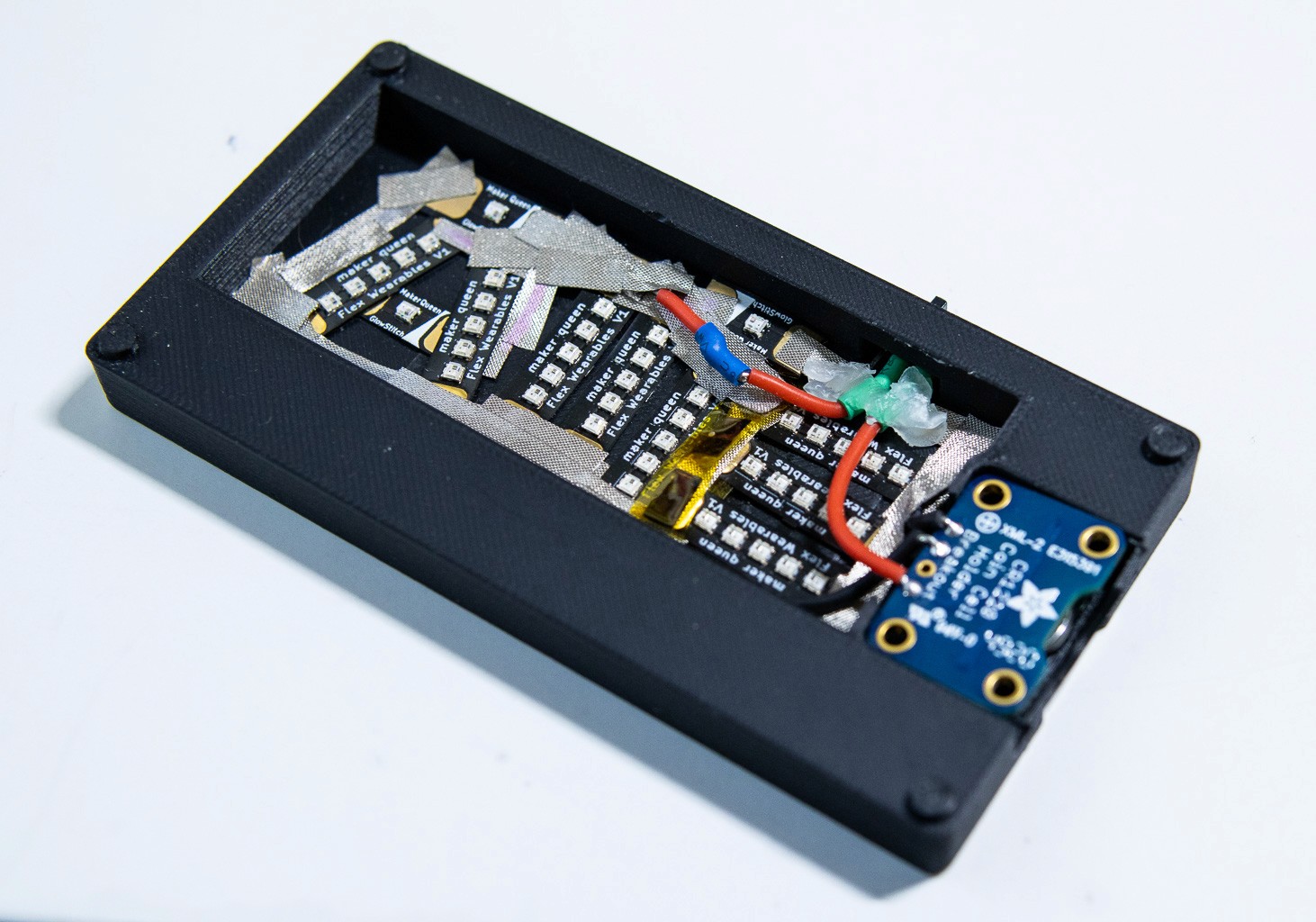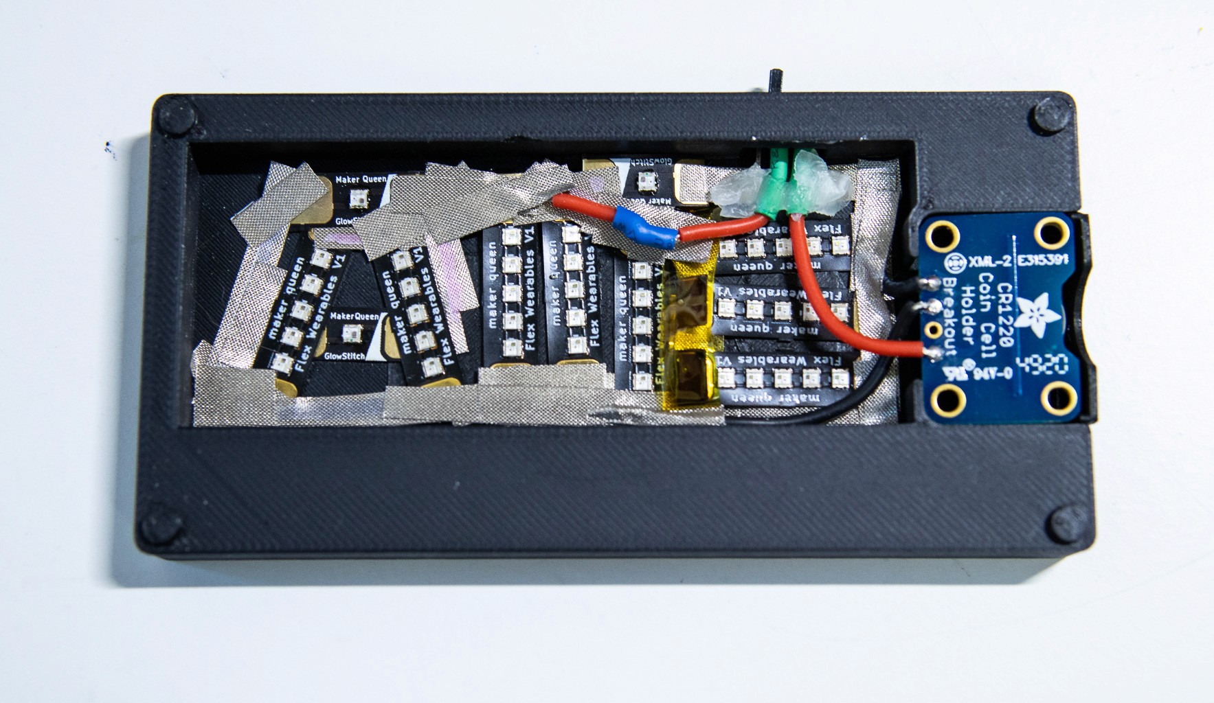Early Iterations & Constraint Testing: The initial prototypes prioritized simplicity, utilizing Lilypad LEDs, LED noodles, and GlowStitch LEDs powered by coin-cell batteries. These early builds quickly revealed a bottleneck: while coin-cell batteries were ideal for user experience, they could not provide the necessary current for bright, sustained backlighting. I pivoted the design to utilize 3.7V lithium polymer (LiPo) batteries, trading a slight increase in thickness for vastly superior power output.